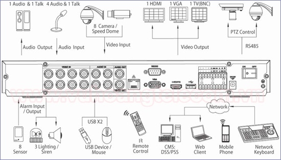 - Cho phép ghi hình, xem lại, truyền dữ liệu qua mạng, sao lưu, giám sát trên điện thoại iPhone, iPad, Android, Windows Phone